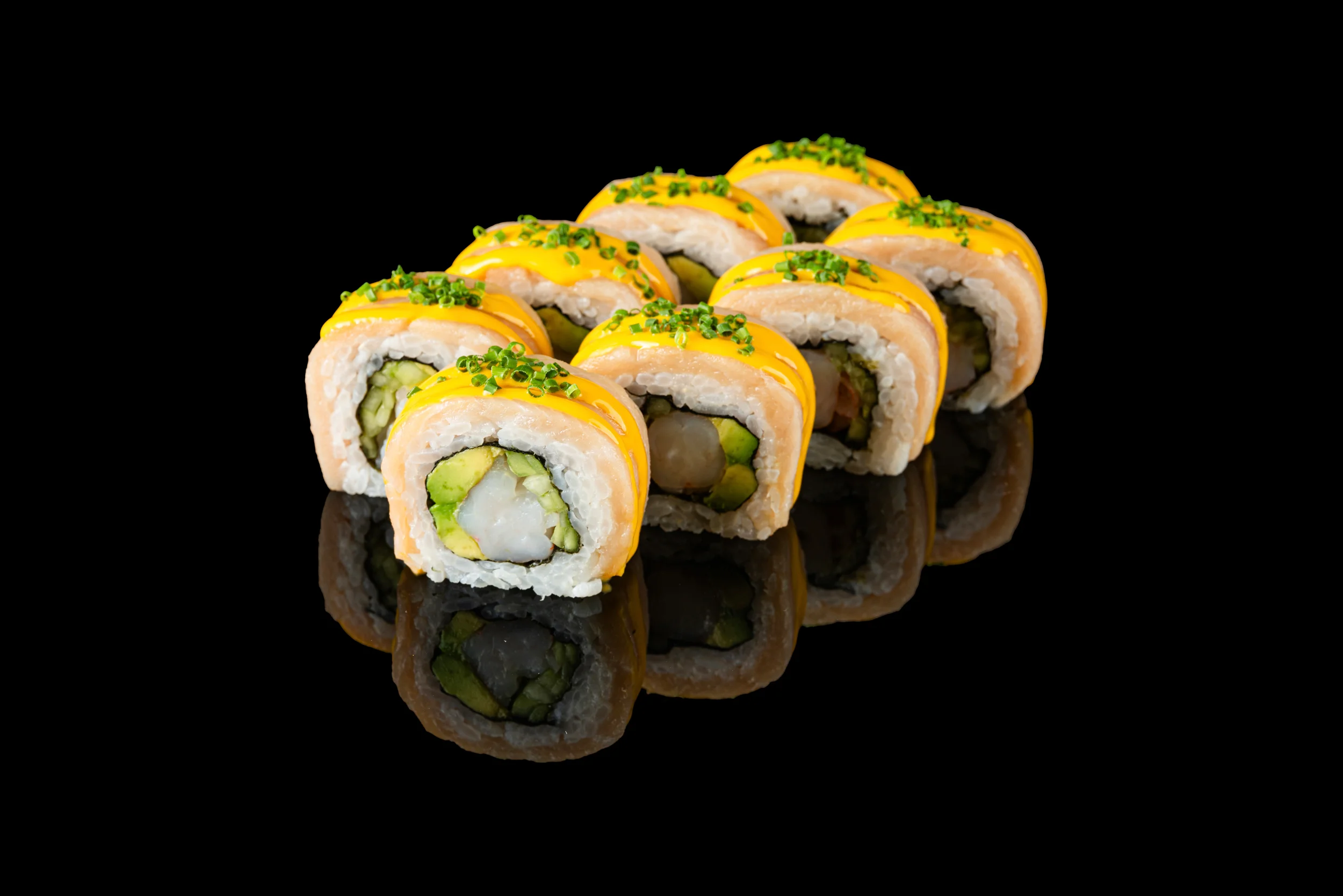 rice, nori, hamachi, shrimp, avocado, cucumber, yuzu truffle sauce, chives, ginger, wasabi, soy sauce (8pcs)